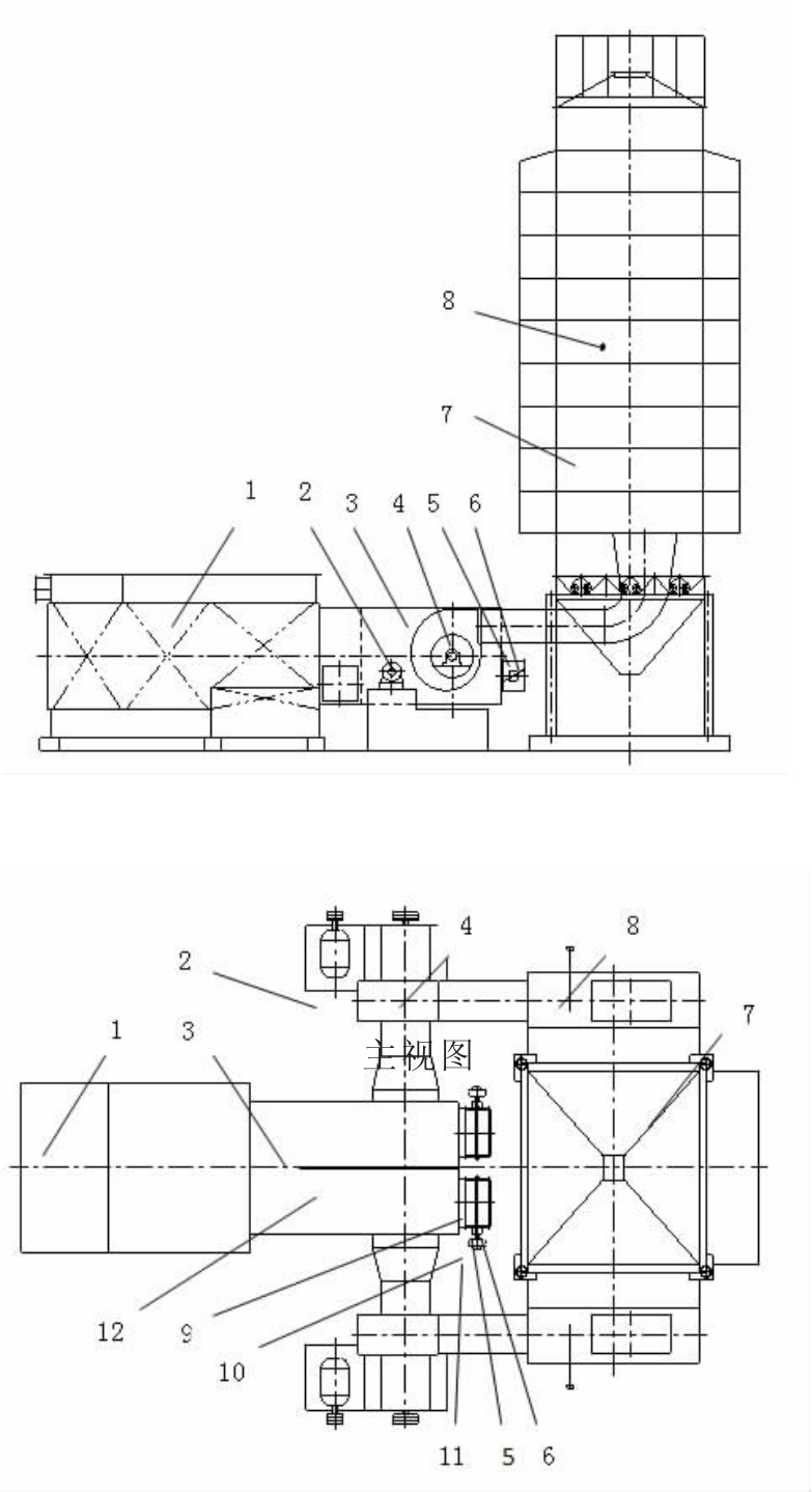 1.熱交換器;2.電機(jī);3.混合室;4.主風(fēng)機(jī);5.調(diào)風(fēng)筒;6.風(fēng)門板;7.種子干燥機(jī);8.溫度傳感器;9.閥門軸;10.聯(lián)軸器;11.電動(dòng)執(zhí)行器;俯12視.混圖合室中間隔板